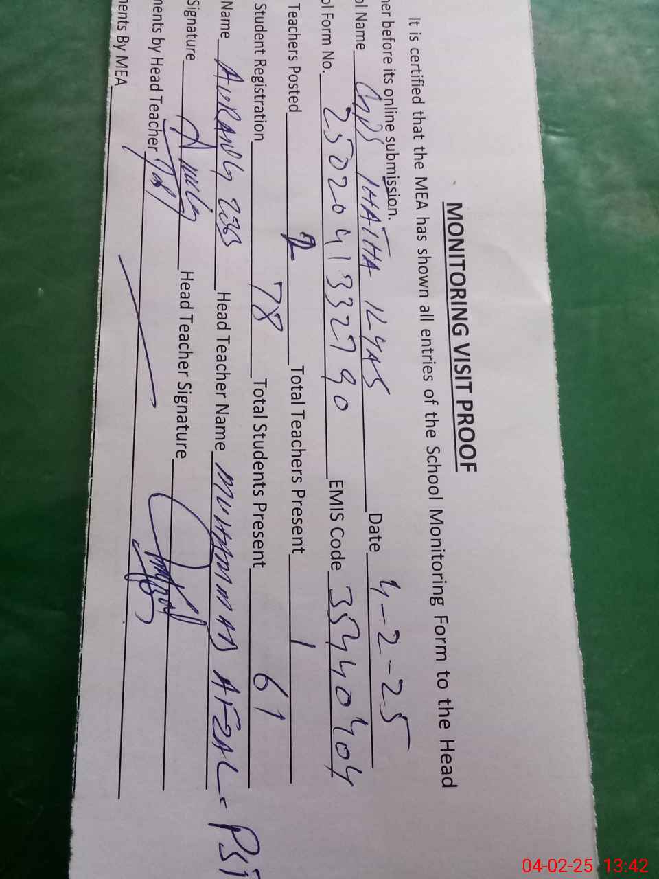 | Attendance Register | Head Teacher | MEA with School | Visit Proof |