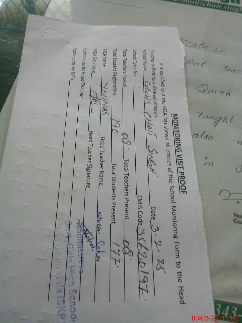 | Attendance Register | Head Teacher | MEA with School | Visit Proof |