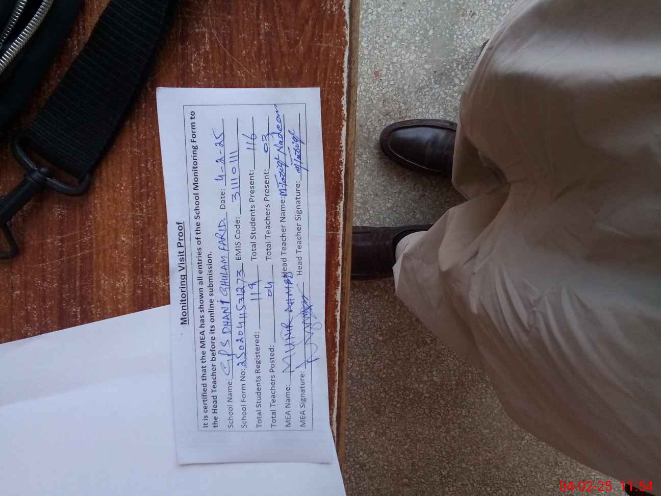 | Attendance Register | Head Teacher | MEA with School | Visit Proof |