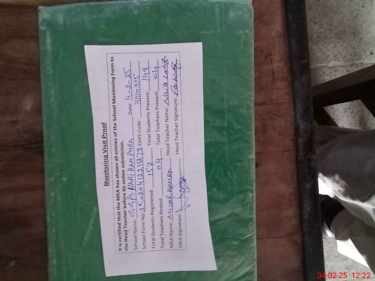 | EMIS Code: 31110315 | Name of School: GGPS HARI RAM PURA | |||