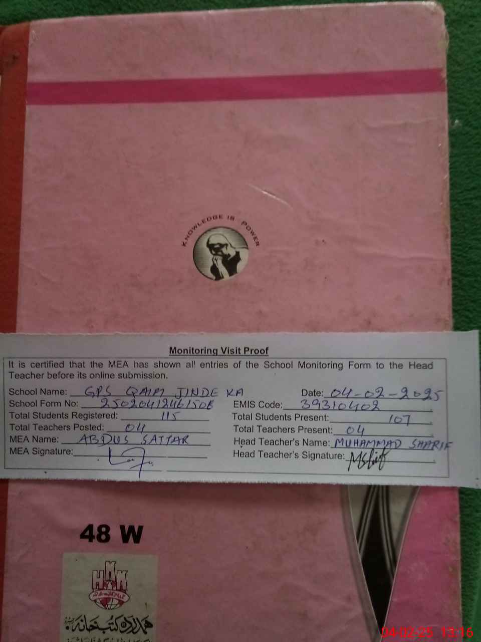 | Attendance Register | Head Teacher | MEA with School | Visit Proof |