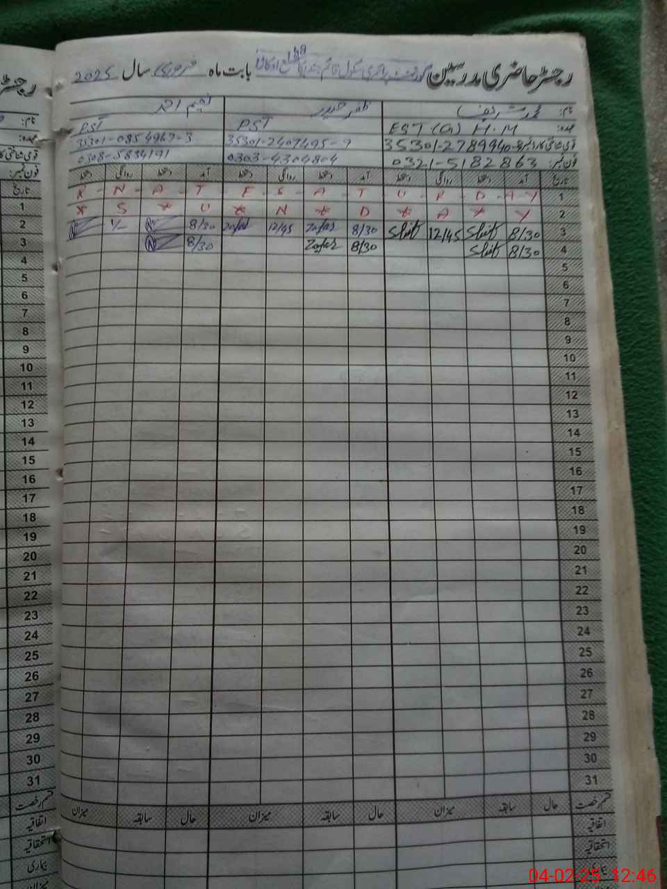 | CNIC | Full Name | Designation | R/C | Absence During Last Calender Month |