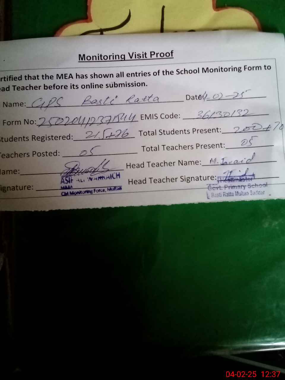 | Attendance Register | Head Teacher | MEA with School | Visit Proof |