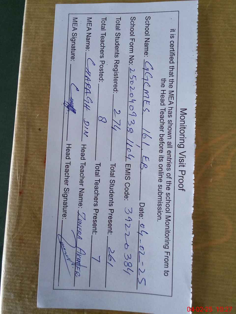 | Attendance Register | Head Teacher | MEA with School | Visit Proof |