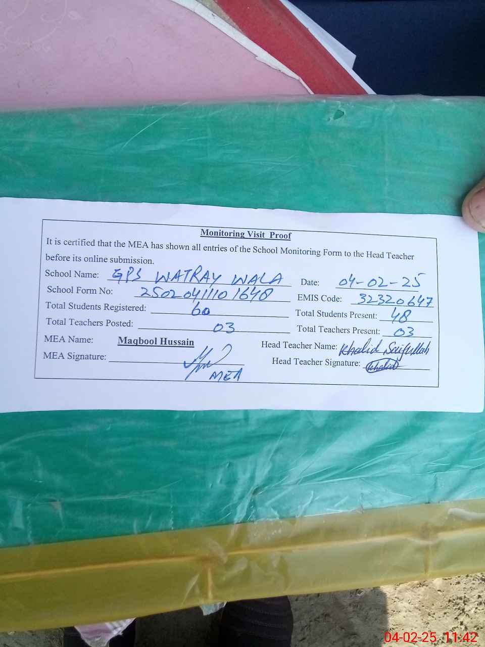 | EMIS Code: 32320647 | Name of School: GPS WATRAY WALA | |||