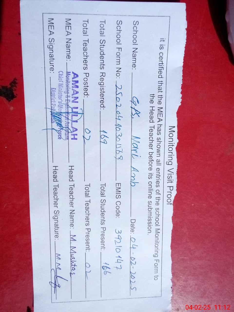 | Attendance Register | Head Teacher | MEA with School | Visit Proof |