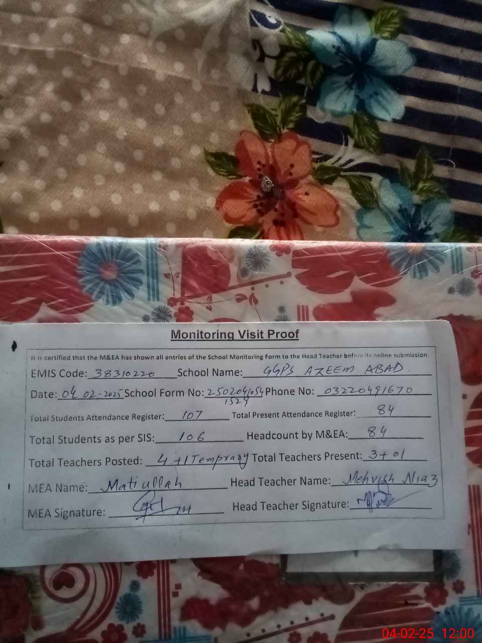 | EMIS Code: 38310220 | Name of School: GGPS AZEEM ABAD | |||