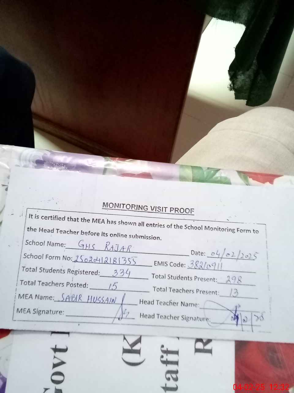 | Attendance Register | Head Teacher | MEA with School | Visit Proof |