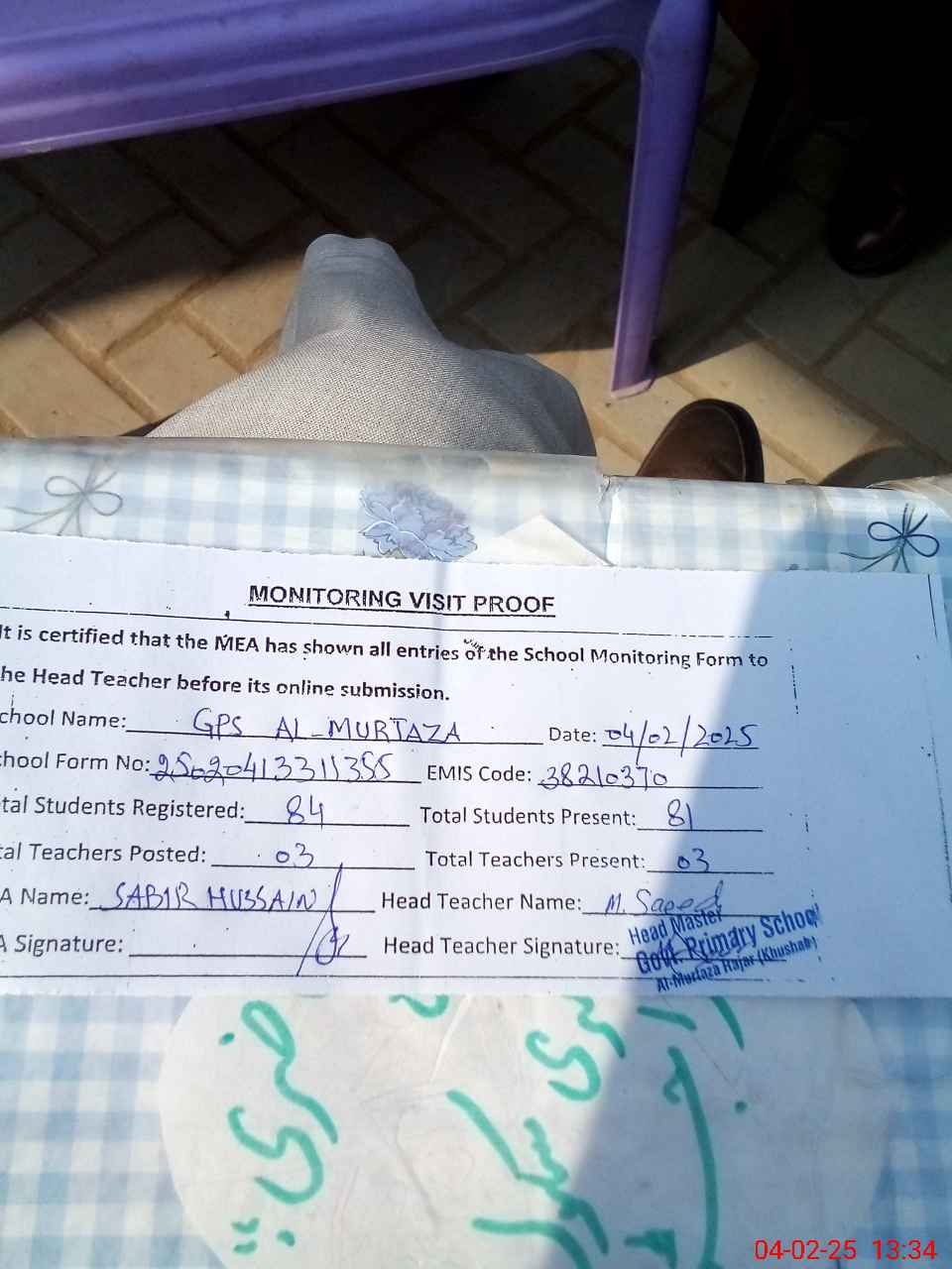 | Attendance Register | Head Teacher | MEA with School | Visit Proof |