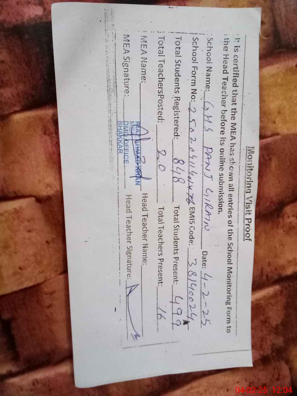 | Attendance Register | Head Teacher | MEA with School | Visit Proof |