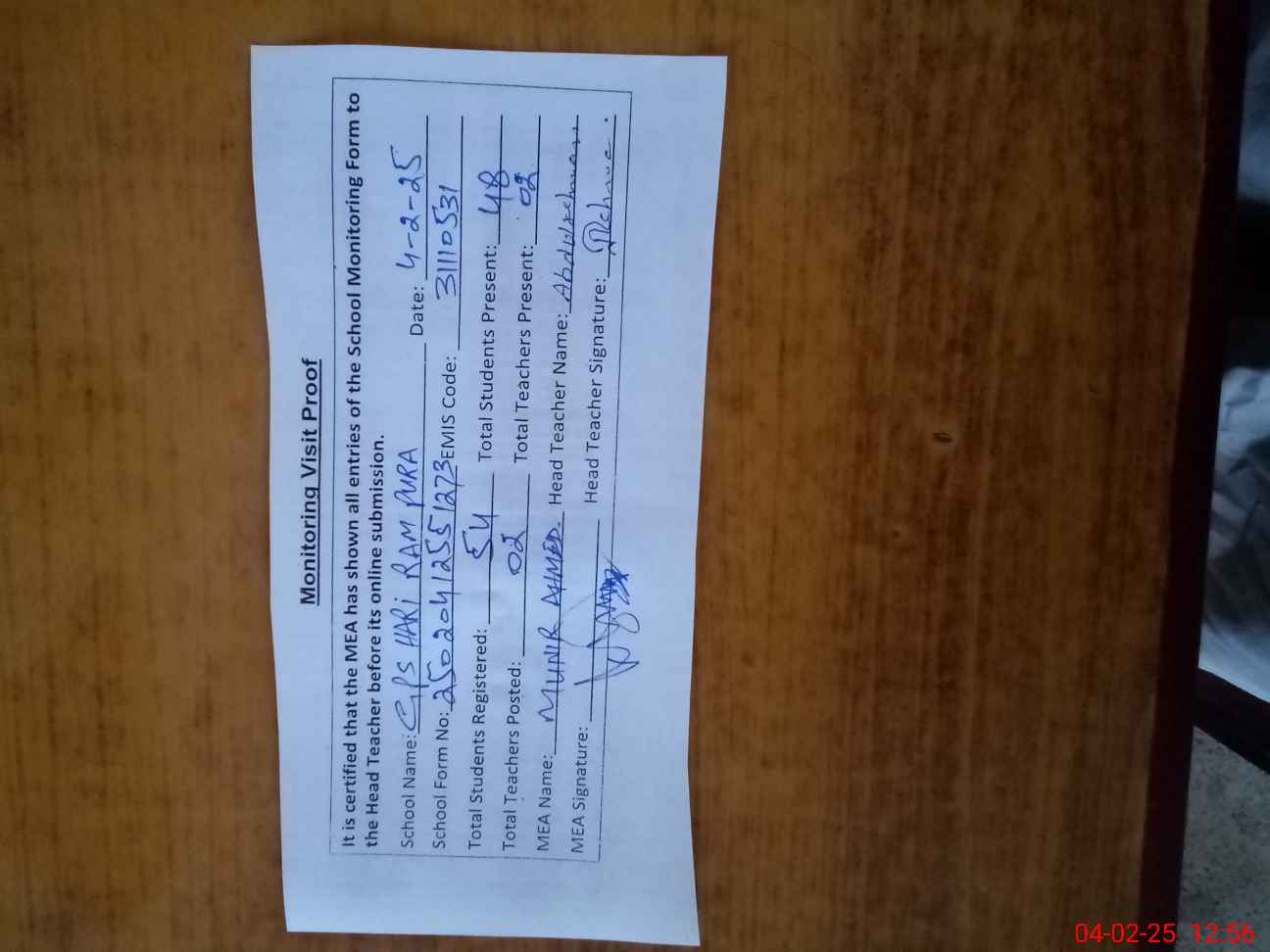 | Attendance Register | Head Teacher | MEA with School | Visit Proof |