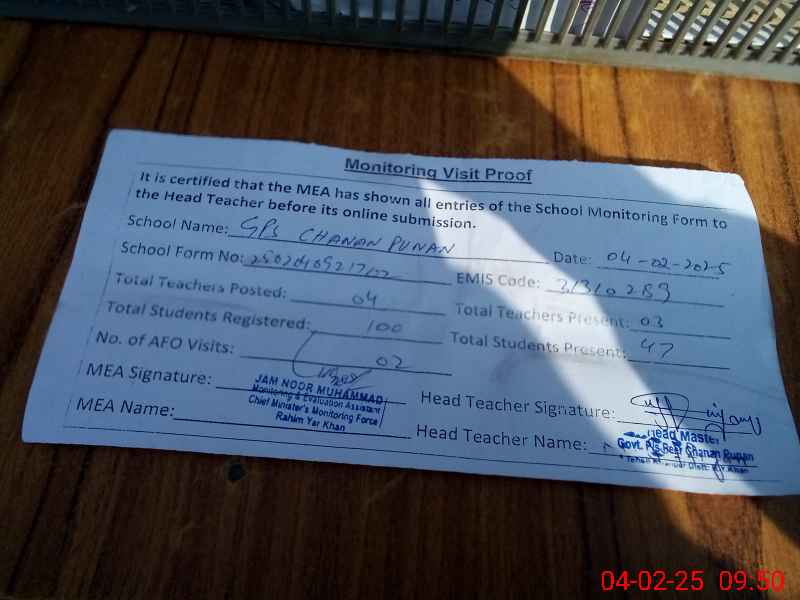 | EMIS Code: 31310289 | Name of School: GPS CHANAN PUNANN | |||