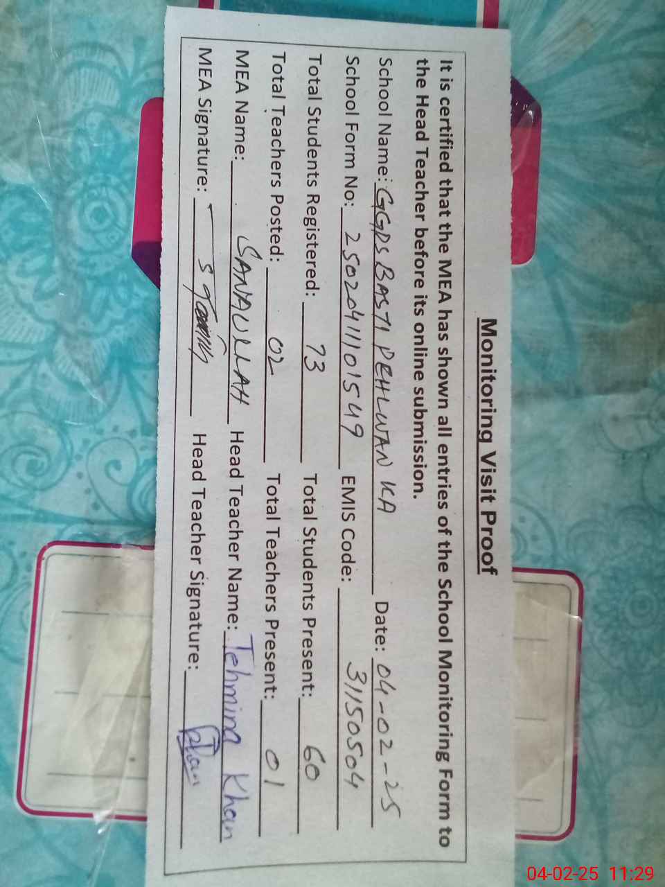 | Attendance Register | Head Teacher | MEA with School | Visit Proof |