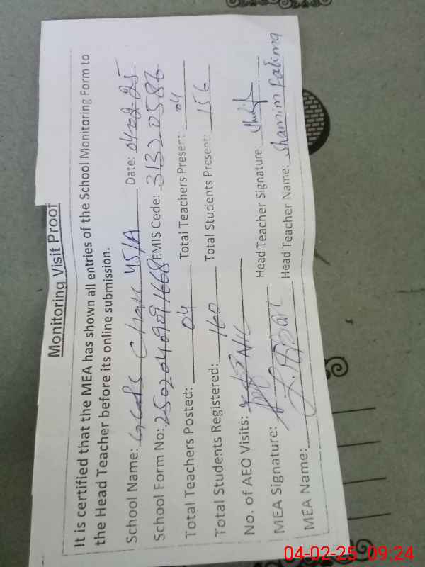 | Attendance Register | Head Teacher | MEA with School | Visit Proof |