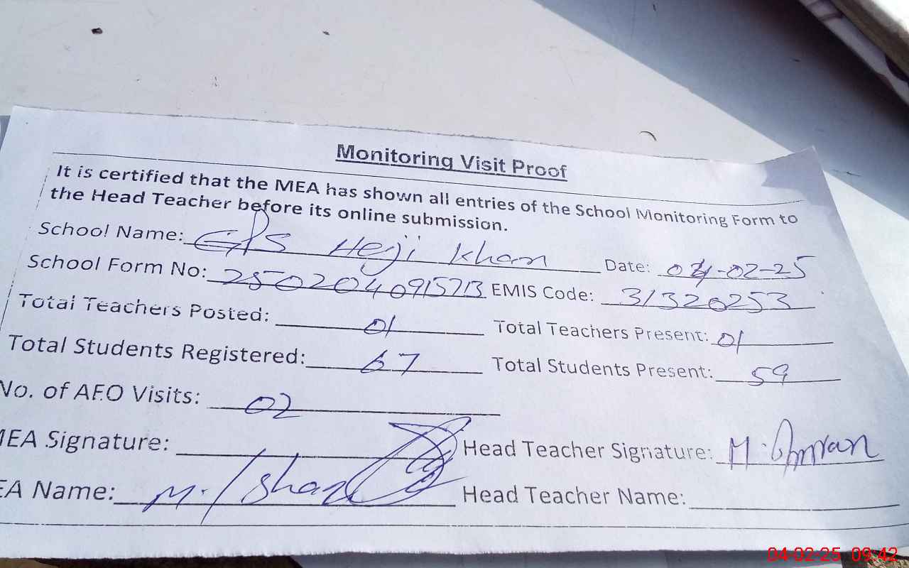 | Attendance Register | Head Teacher | MEA with School | Visit Proof |
