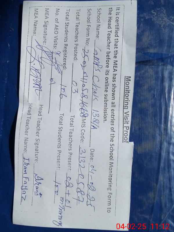 | EMIS Code: 31320587 | Name of School: GMPS CHAK NO.138/A | |||