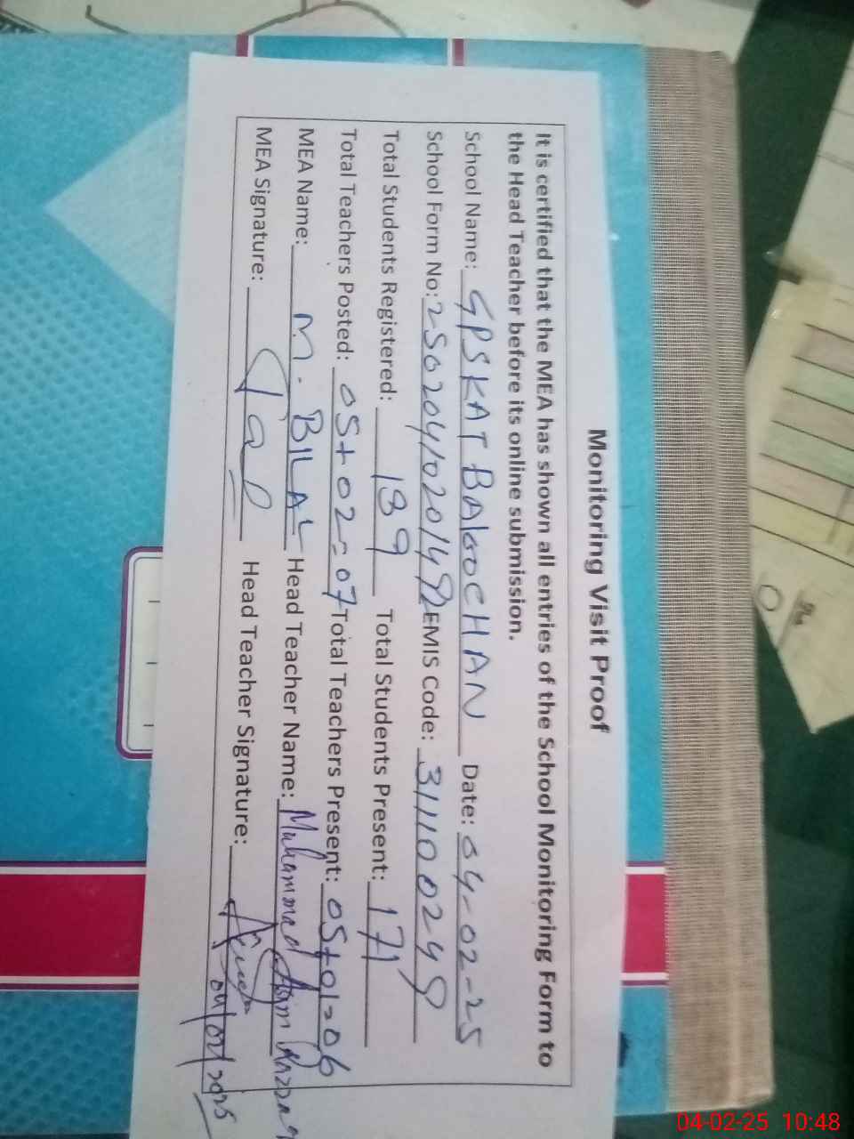 | Attendance Register | Head Teacher | MEA with School | Visit Proof |