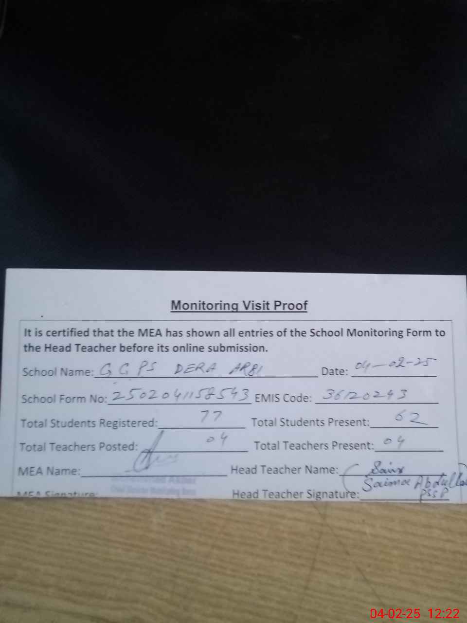 | EMIS Code: 36120243 | Name of School: GGPS DERA AARBI SHUJABAD | |||