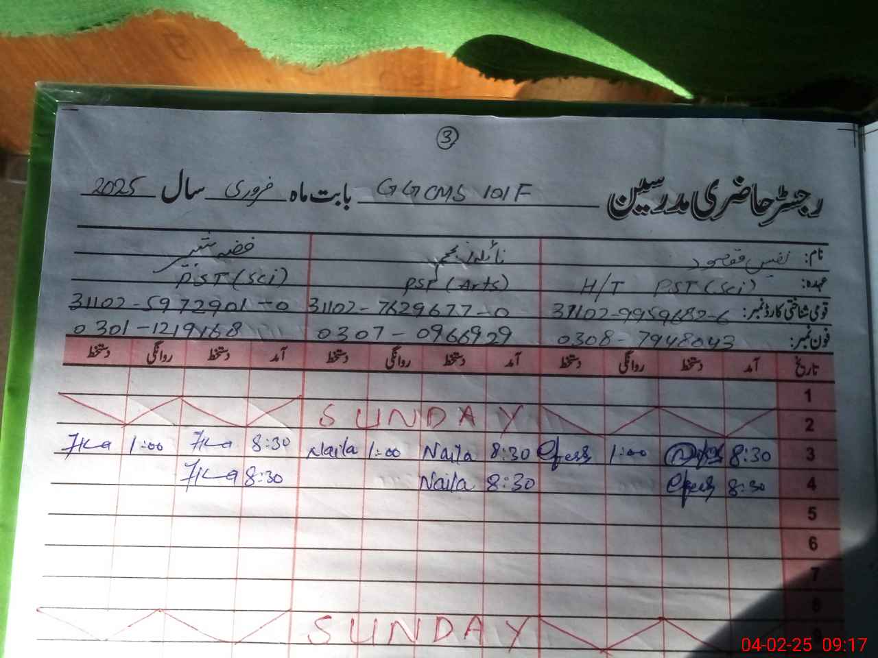 | Name: NA**** MA**** Designation: (School Headmaster's/Headmistress's) PST Phone/Cell Number: 03**** |