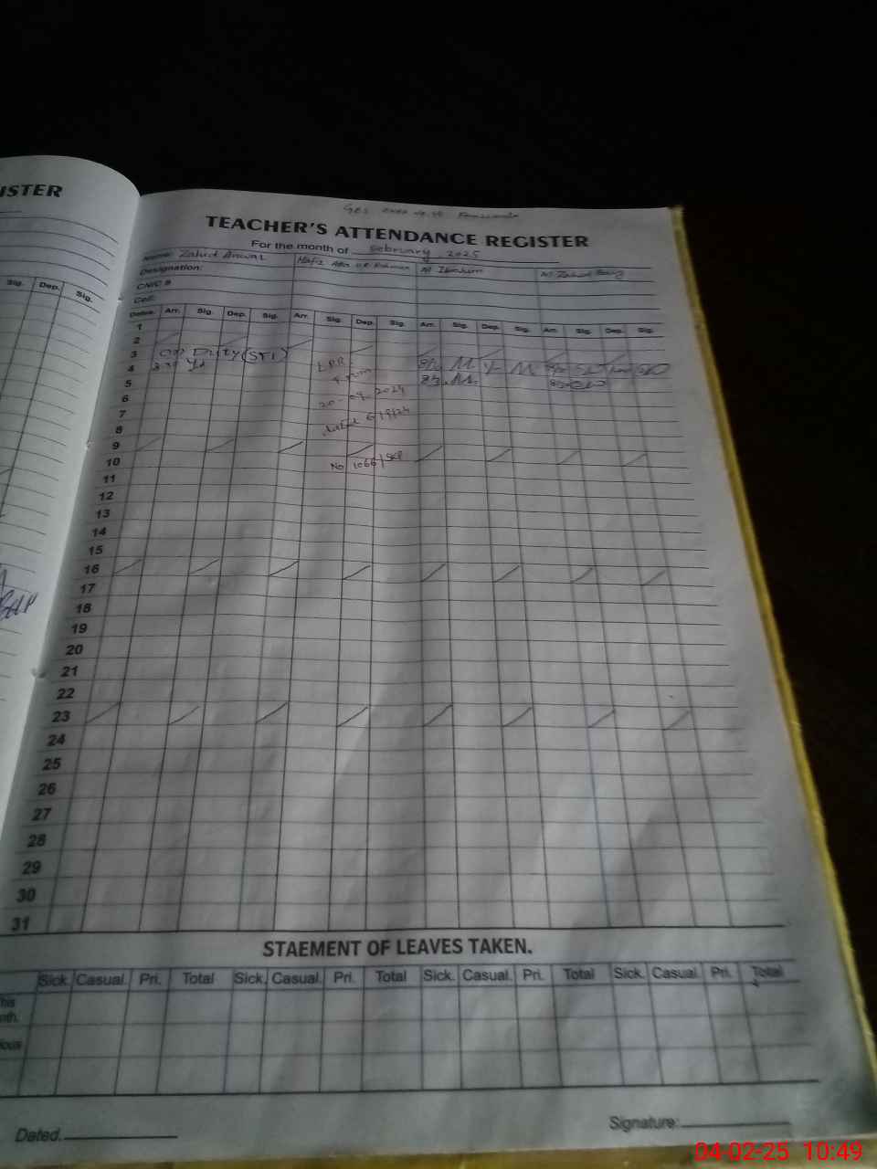 | CNIC | Full Name | Designation | R/C | Absence During Last Calender Month |