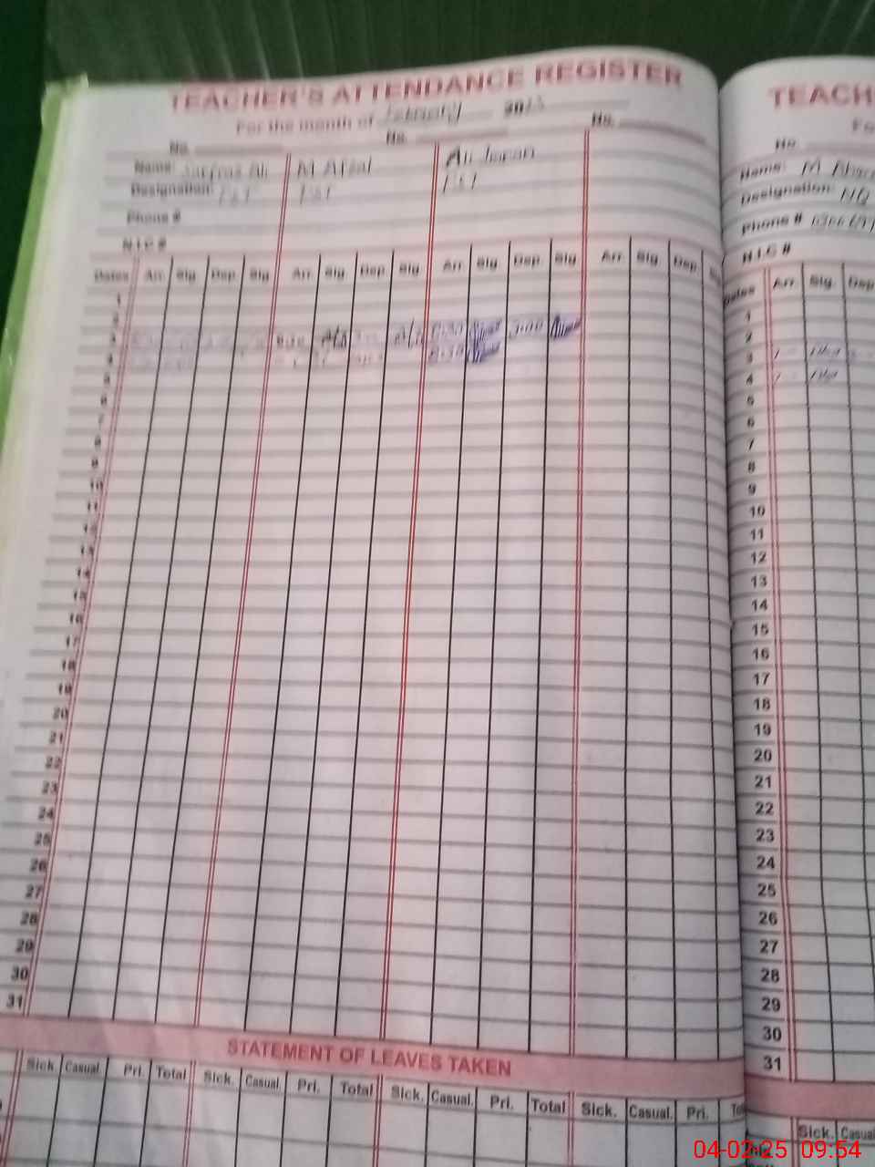 | CNIC | Full Name | Designation | R/C | Absence During Last Calender Month |