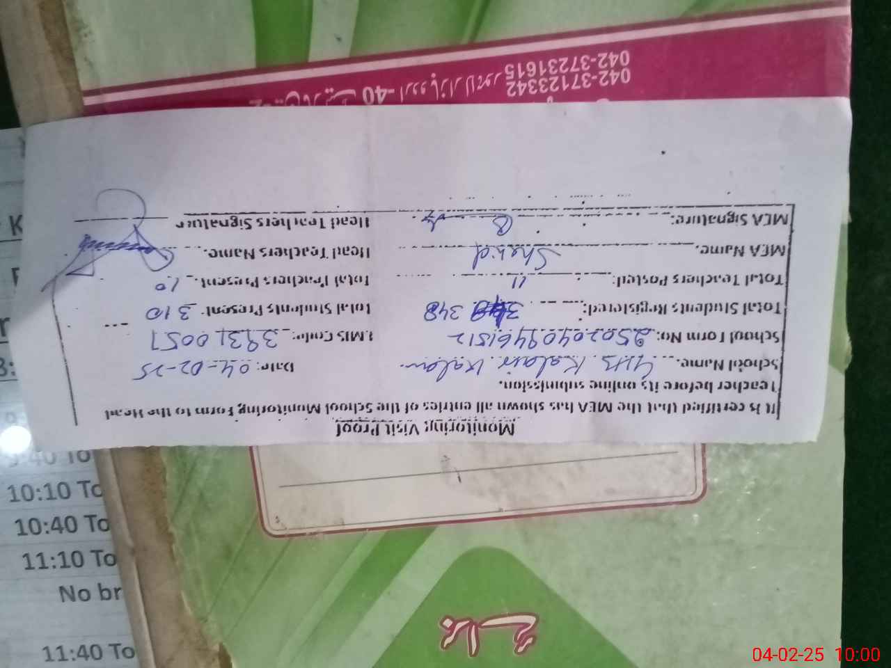 | Certified that this School was Inspected by the Undersigned MEA/DMO Today and the Information Stated Above is as Per Record. | |||||