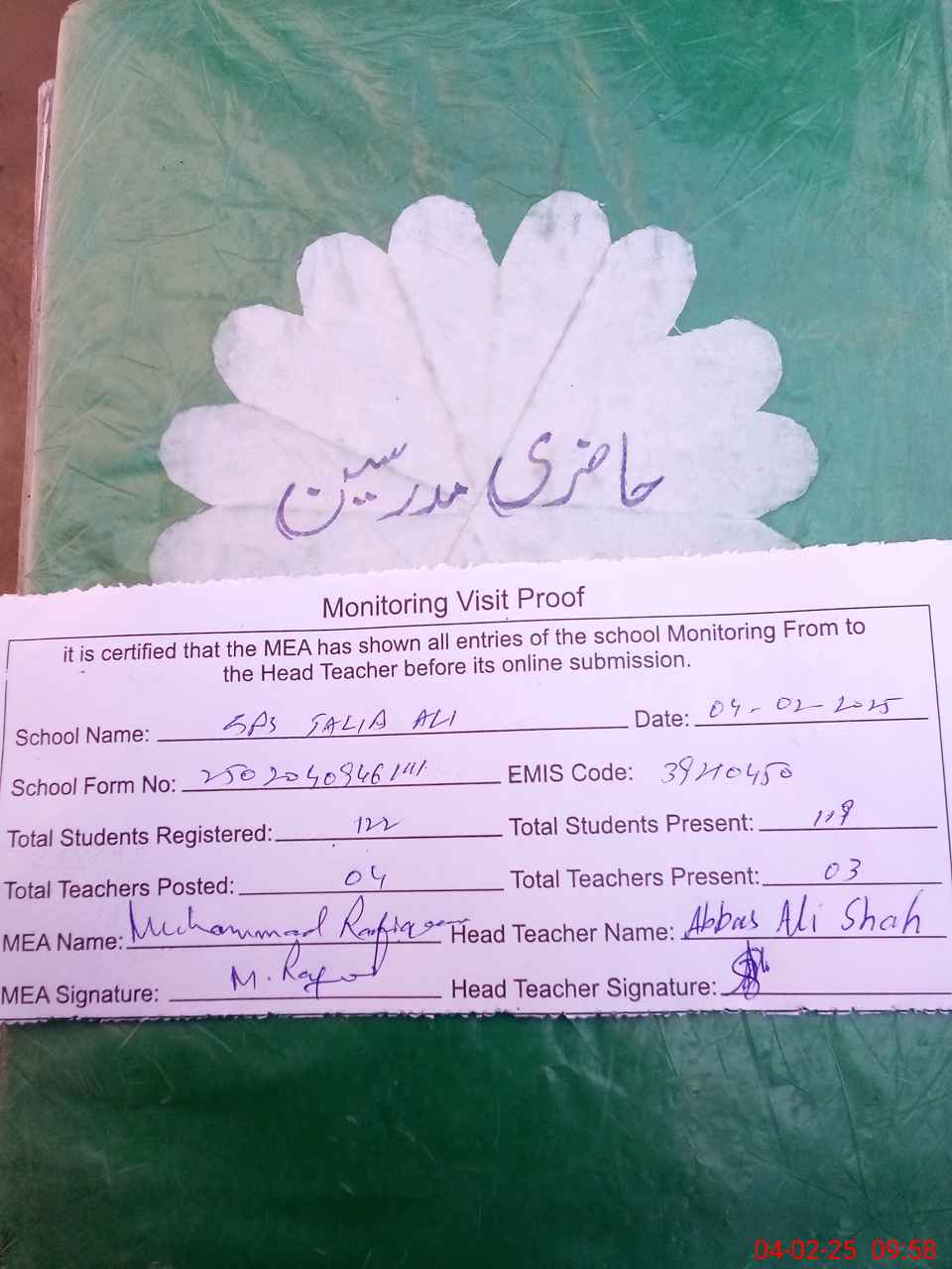 | Attendance Register | Head Teacher | MEA with School | Visit Proof |