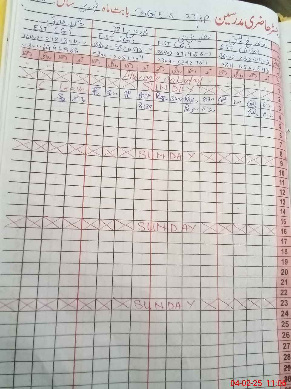 | CNIC | Full Name | Designation | R/C | Absence During Last Calender Month |