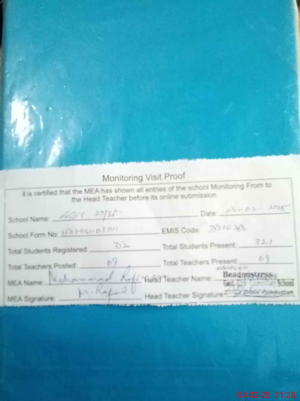| Attendance Register | Head Teacher | MEA with School | Visit Proof |