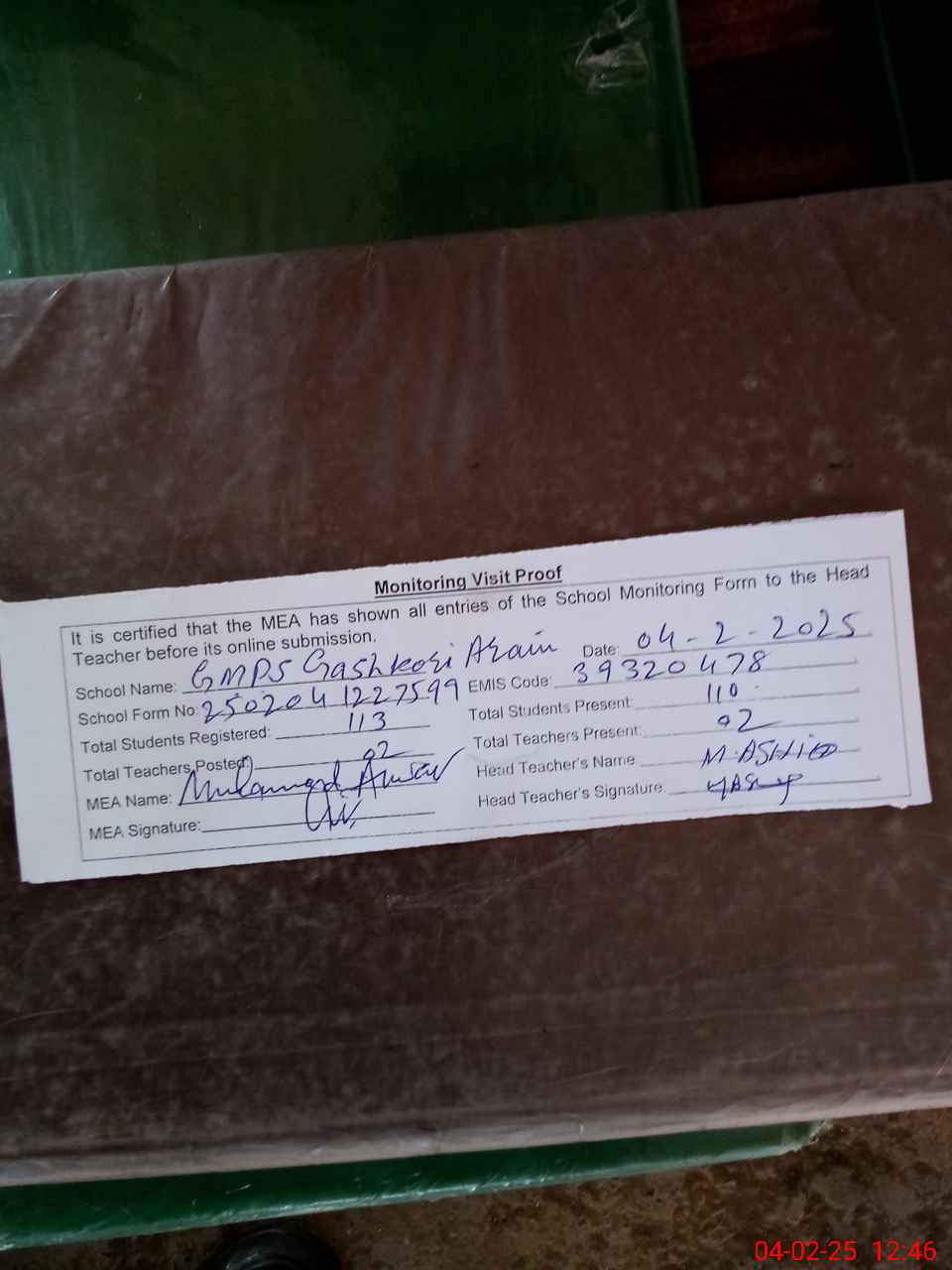 | EMIS Code: 39320478 | Name of School: GMPS GASHKORI ARAIAN | |||