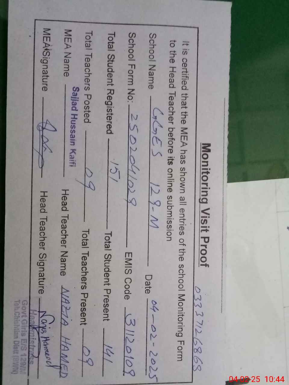| EMIS Code: 31120109 | Name of School: GGES CHAK 129/M | |||