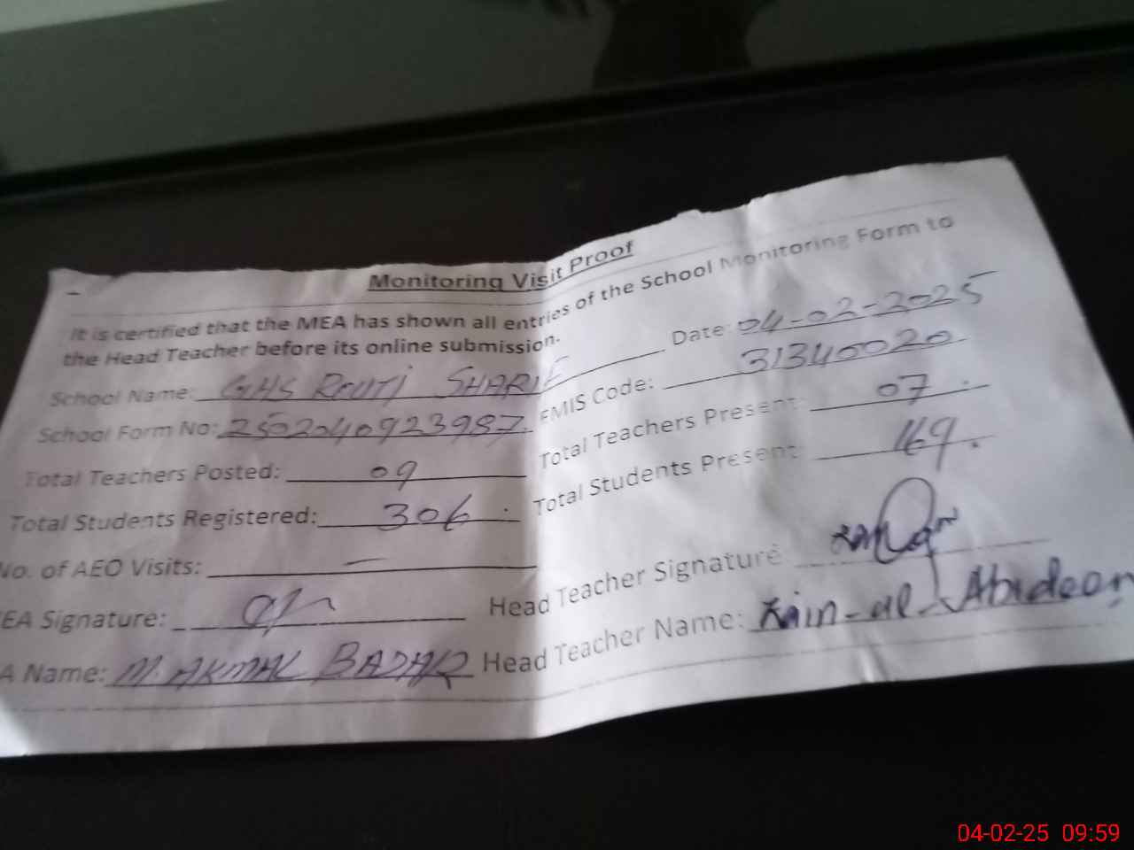 | Attendance Register | Head Teacher | MEA with School | Visit Proof |