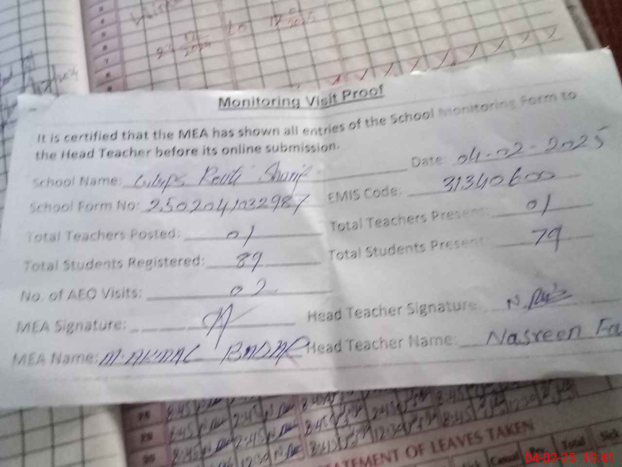 | Attendance Register | Head Teacher | MEA with School | Visit Proof |