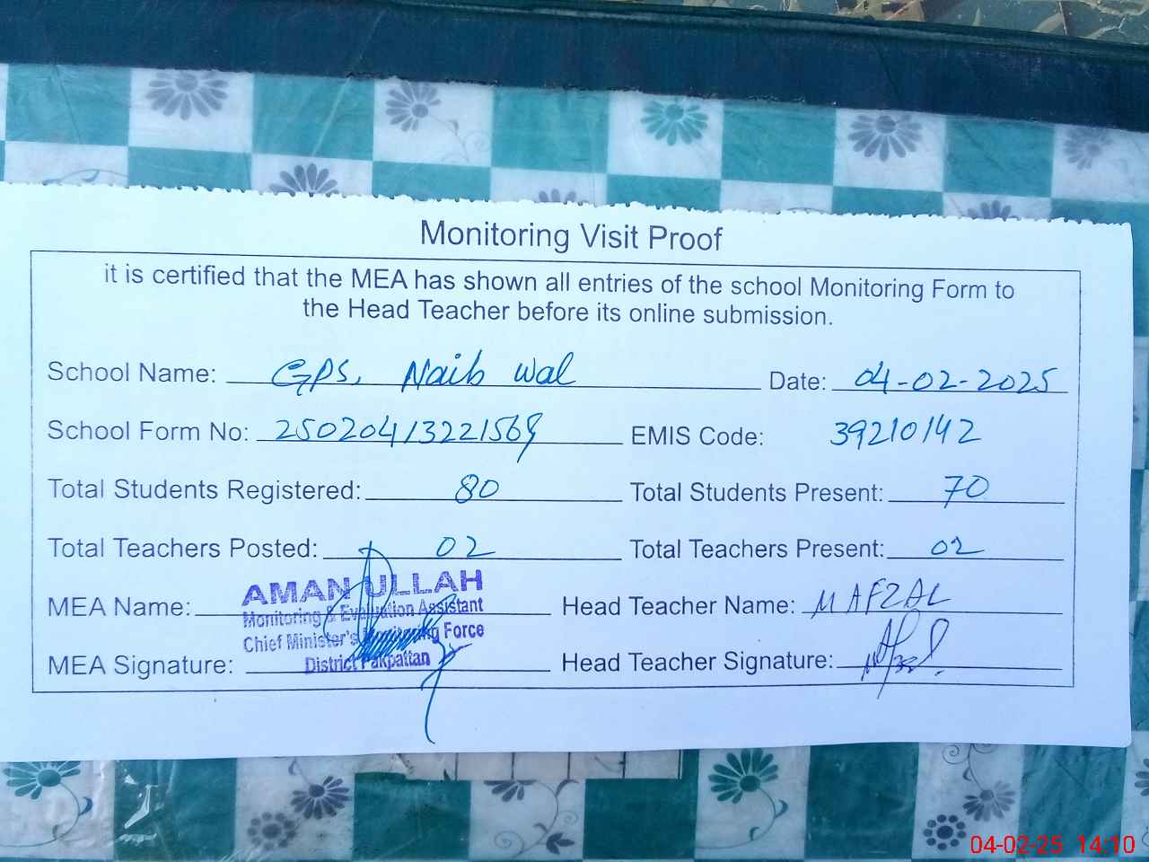| Attendance Register | Head Teacher | MEA with School | Visit Proof |