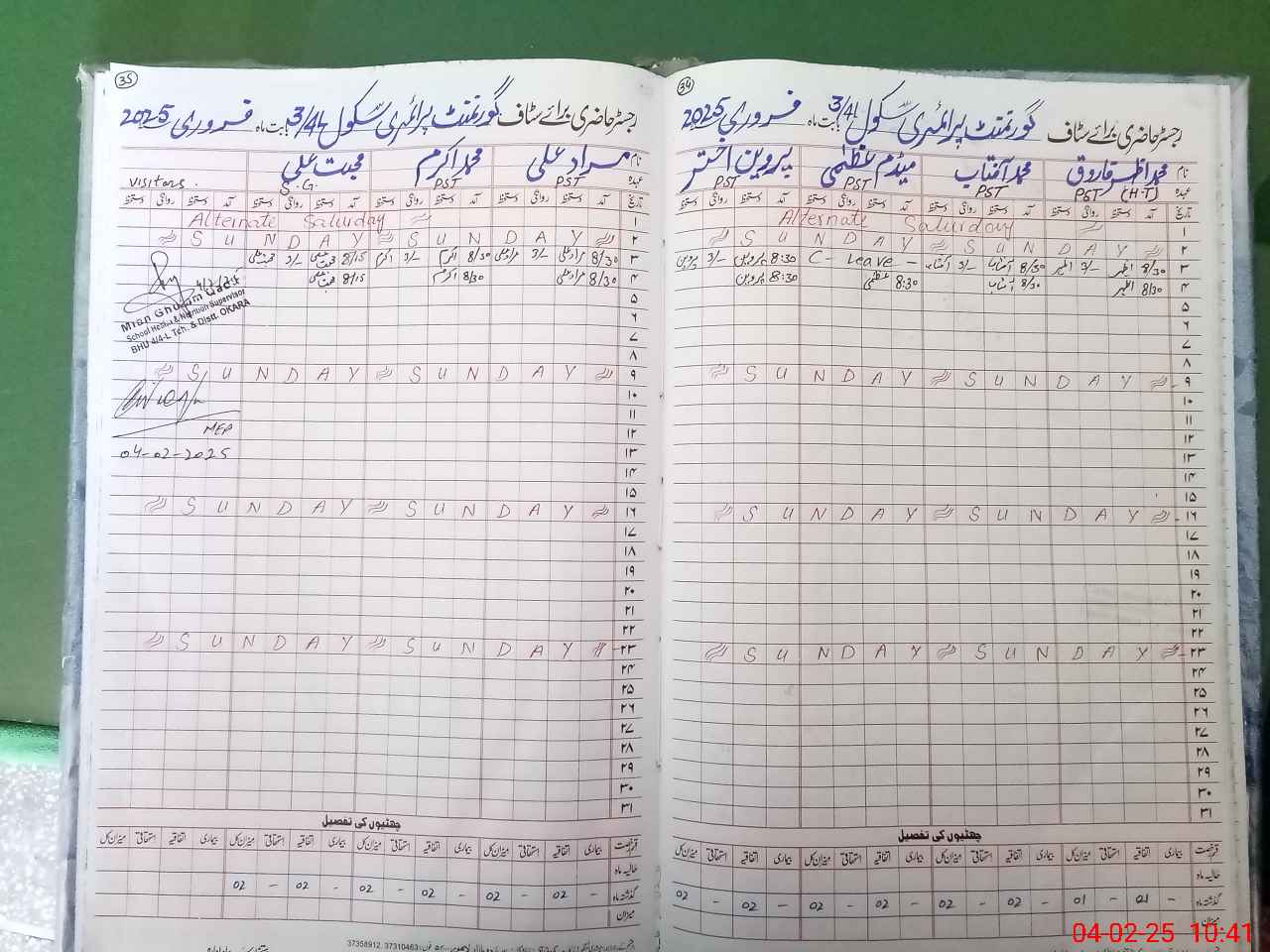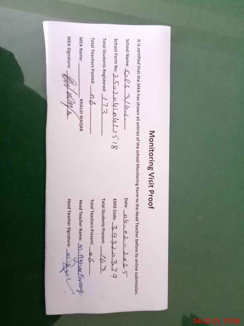 | Attendance Register | Head Teacher | MEA with School | Visit Proof |