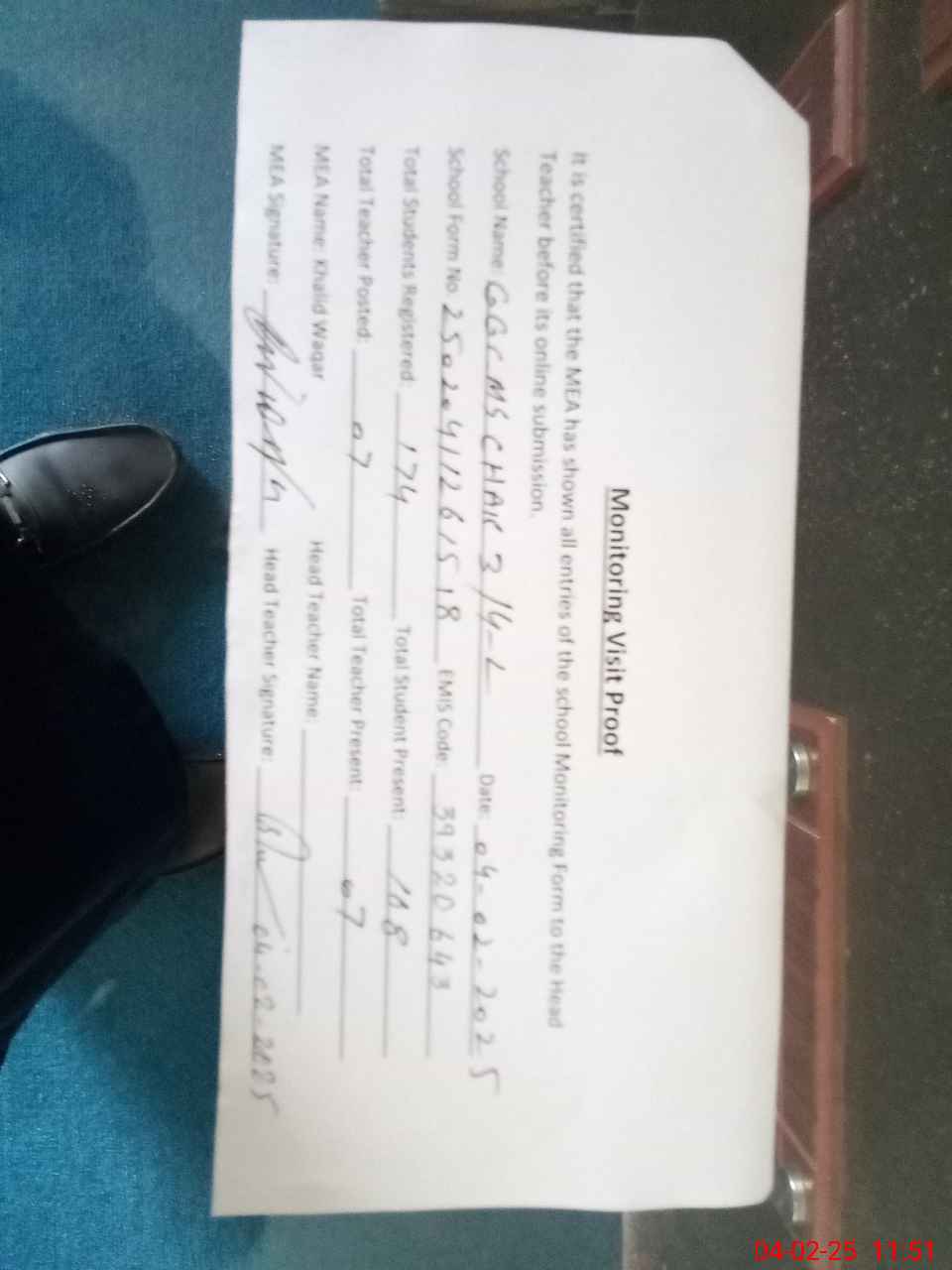 | Attendance Register | Head Teacher | MEA with School | Visit Proof |