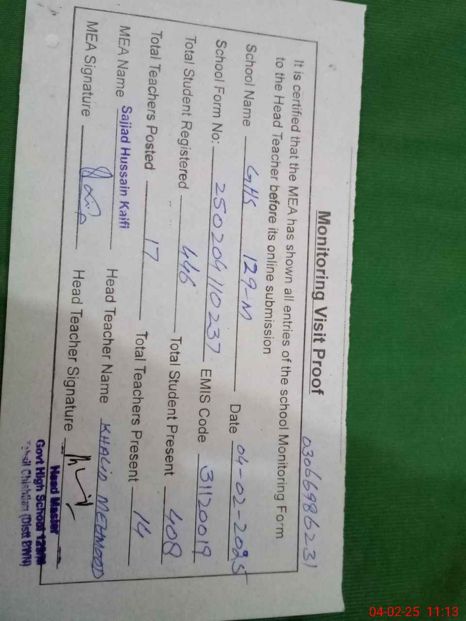 | Name: MNa**** Ul**** Ta**** Designation: (School Headmaster's/Headmistress's) SST G Phone/Cell Number: 03**** |
