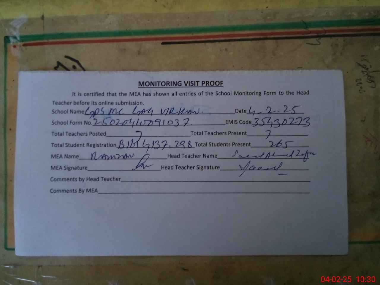 | Attendance Register | Head Teacher | MEA with School | Visit Proof |