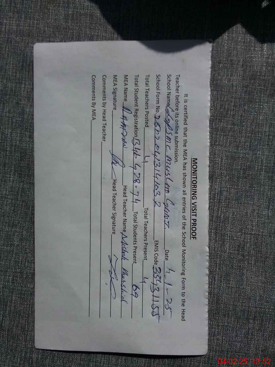 | Attendance Register | Head Teacher | MEA with School | Visit Proof |