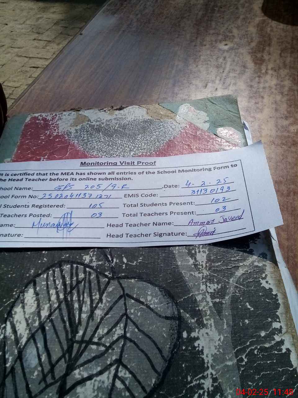 | Attendance Register | Head Teacher | MEA with School | Visit Proof |