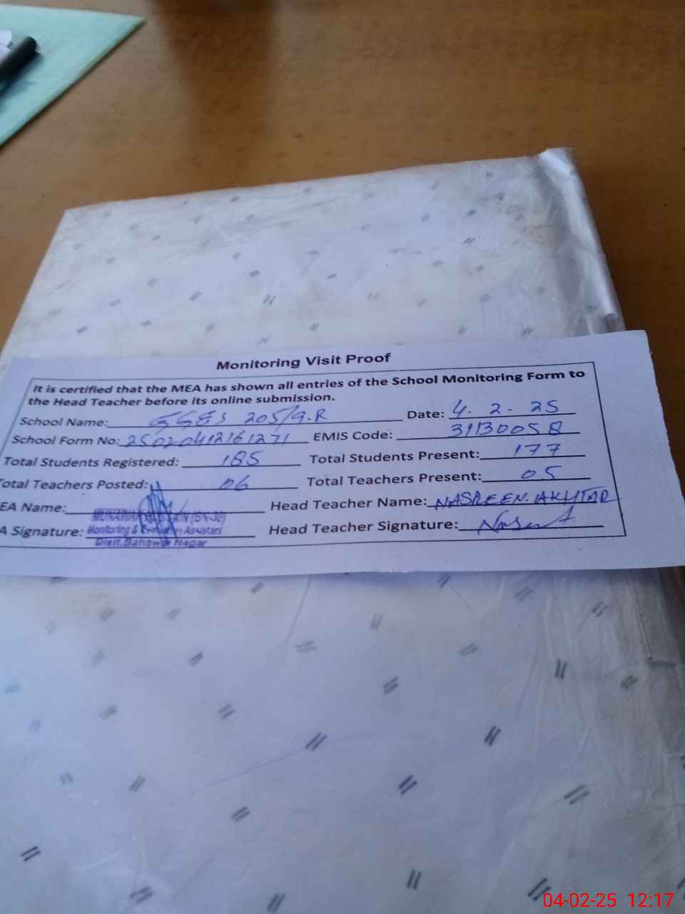 | EMIS Code: 31130058 | Name of School: GGES CHAK 205/9-R | |||