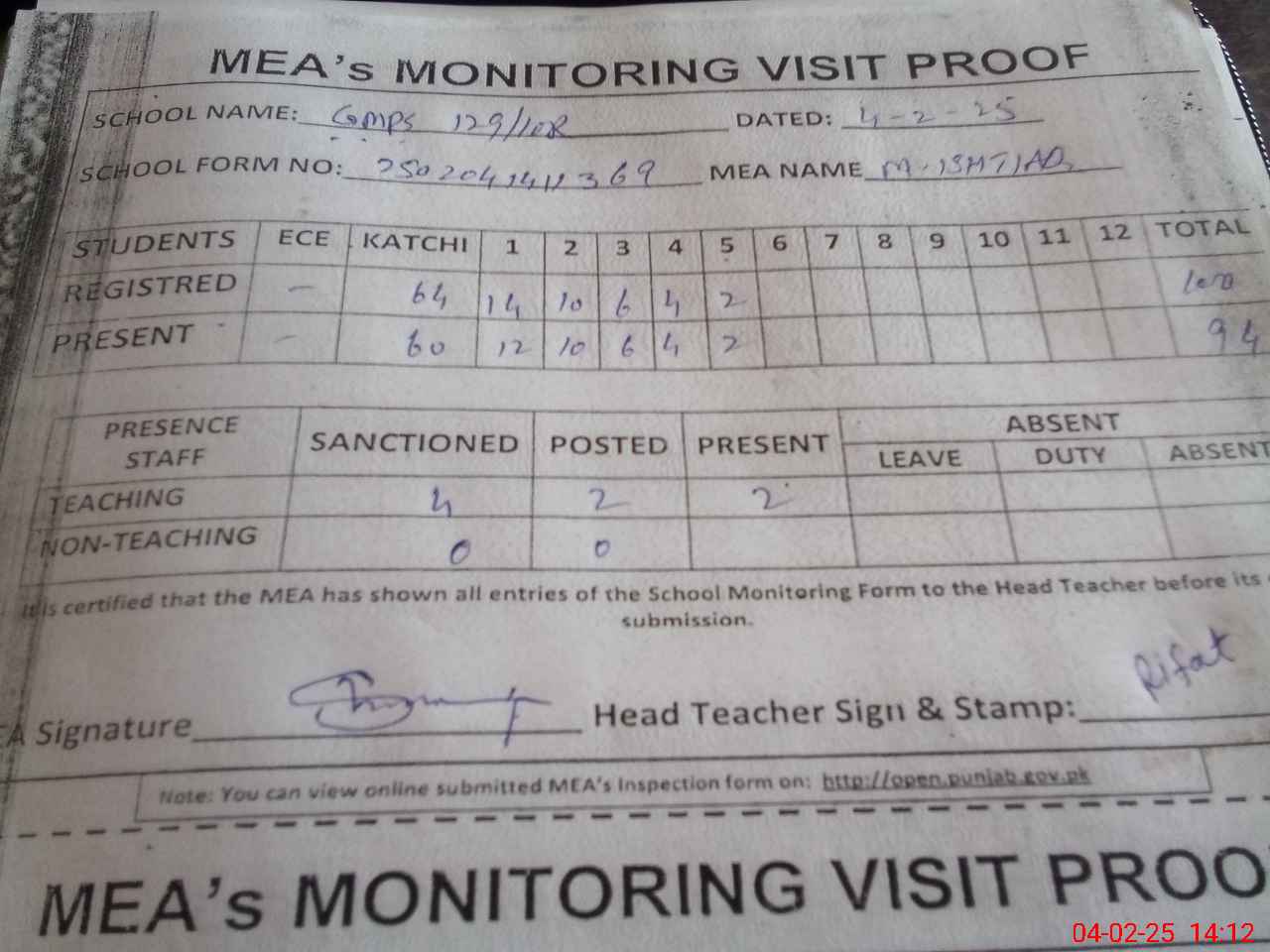 | Attendance Register | Head Teacher | MEA with School | Visit Proof |