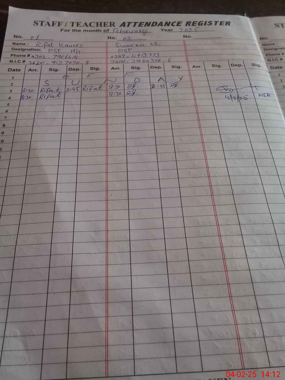 | CNIC | Full Name | Designation | R/C | Absence During Last Calender Month |