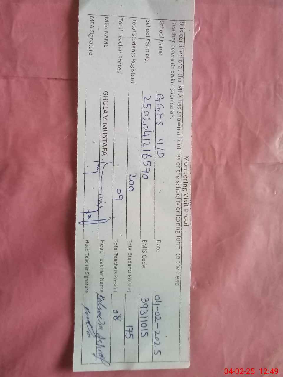 | Attendance Register | Head Teacher | MEA with School | Visit Proof |