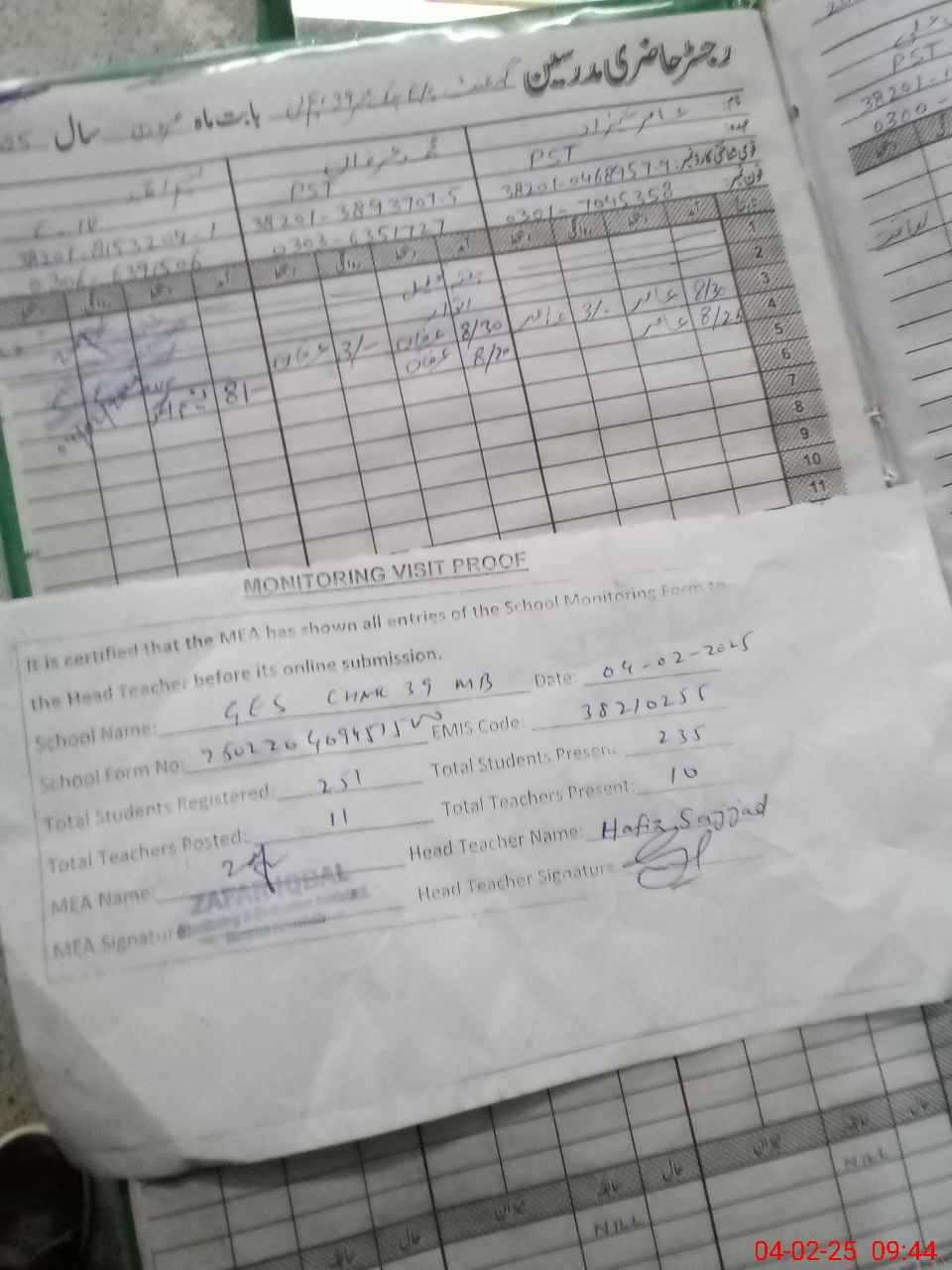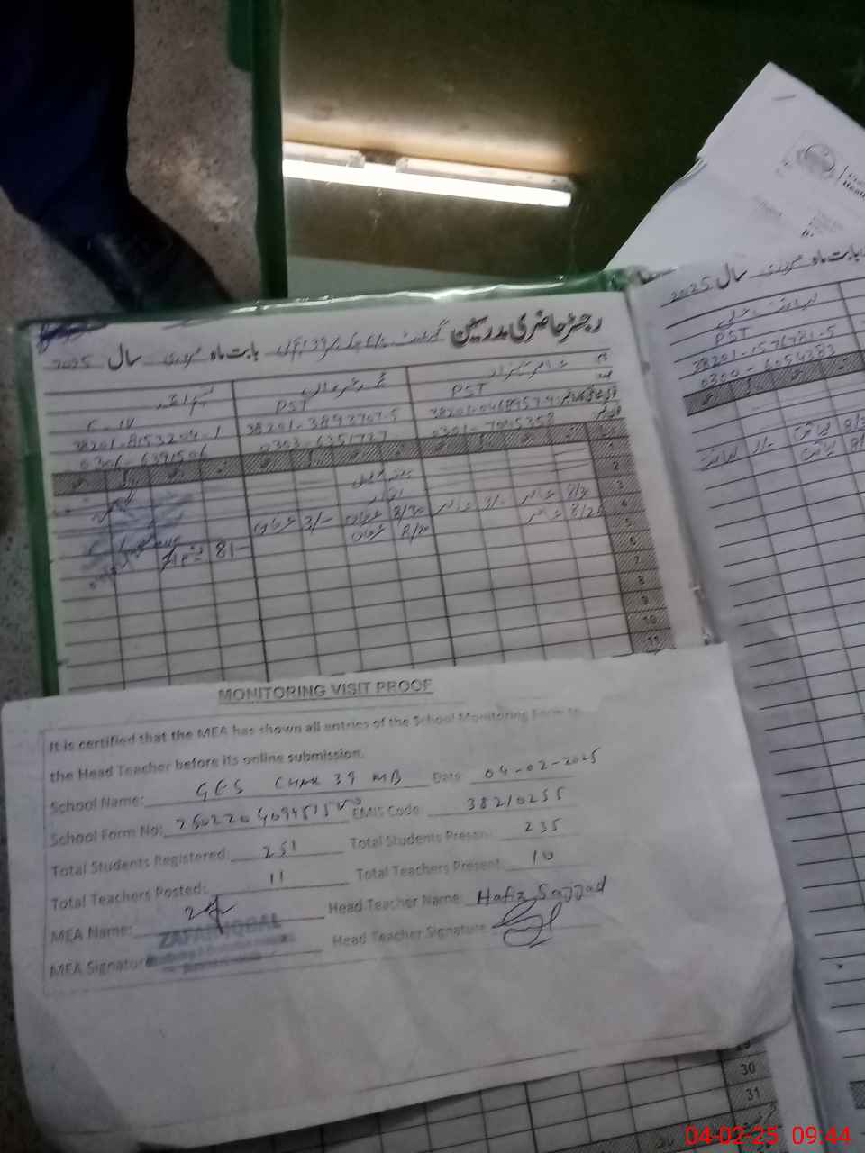| EMIS Code: 38210255 | Name of School: GES CHAK NO 39 MB | |||