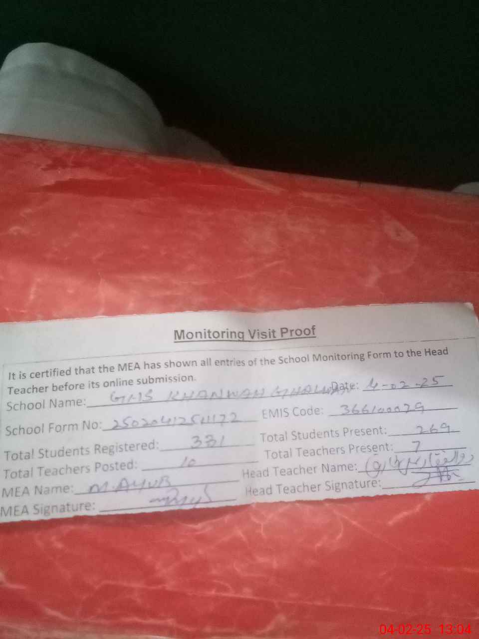 | Attendance Register | Head Teacher | MEA with School | Visit Proof |
