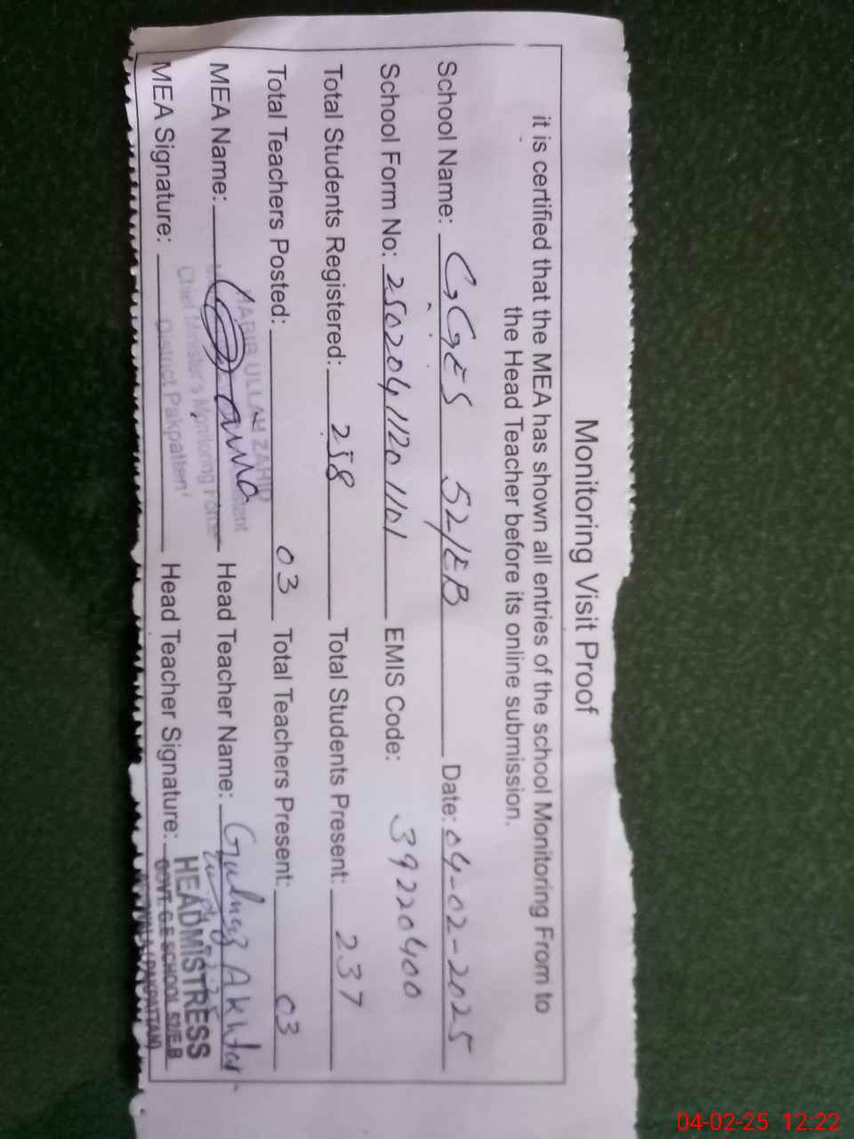 | Attendance Register | Head Teacher | MEA with School | Visit Proof |