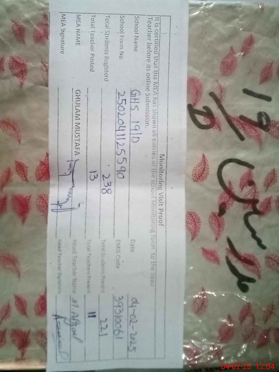| Certified that this School was Inspected by the Undersigned MEA/DMO Today and the Information Stated Above is as Per Record. | |||||