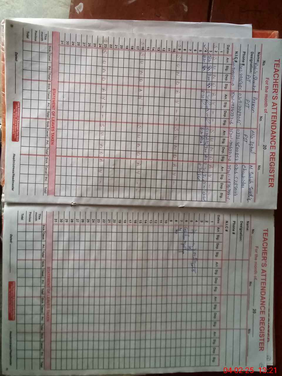 | CNIC | Full Name | Designation | R/C | Absence During Last Calender Month |