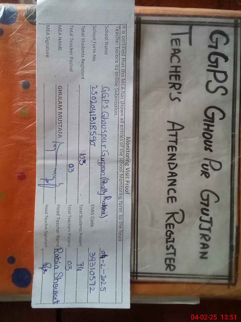 | Attendance Register | Head Teacher | MEA with School | Visit Proof |